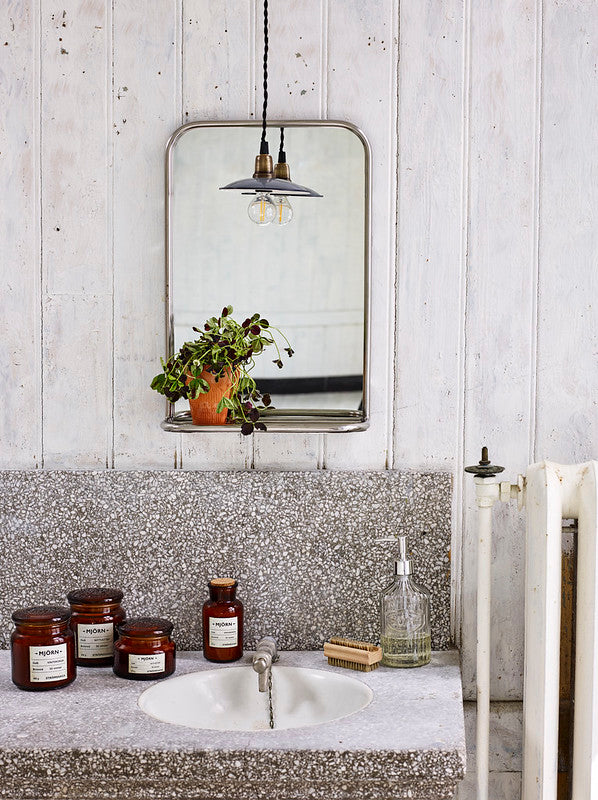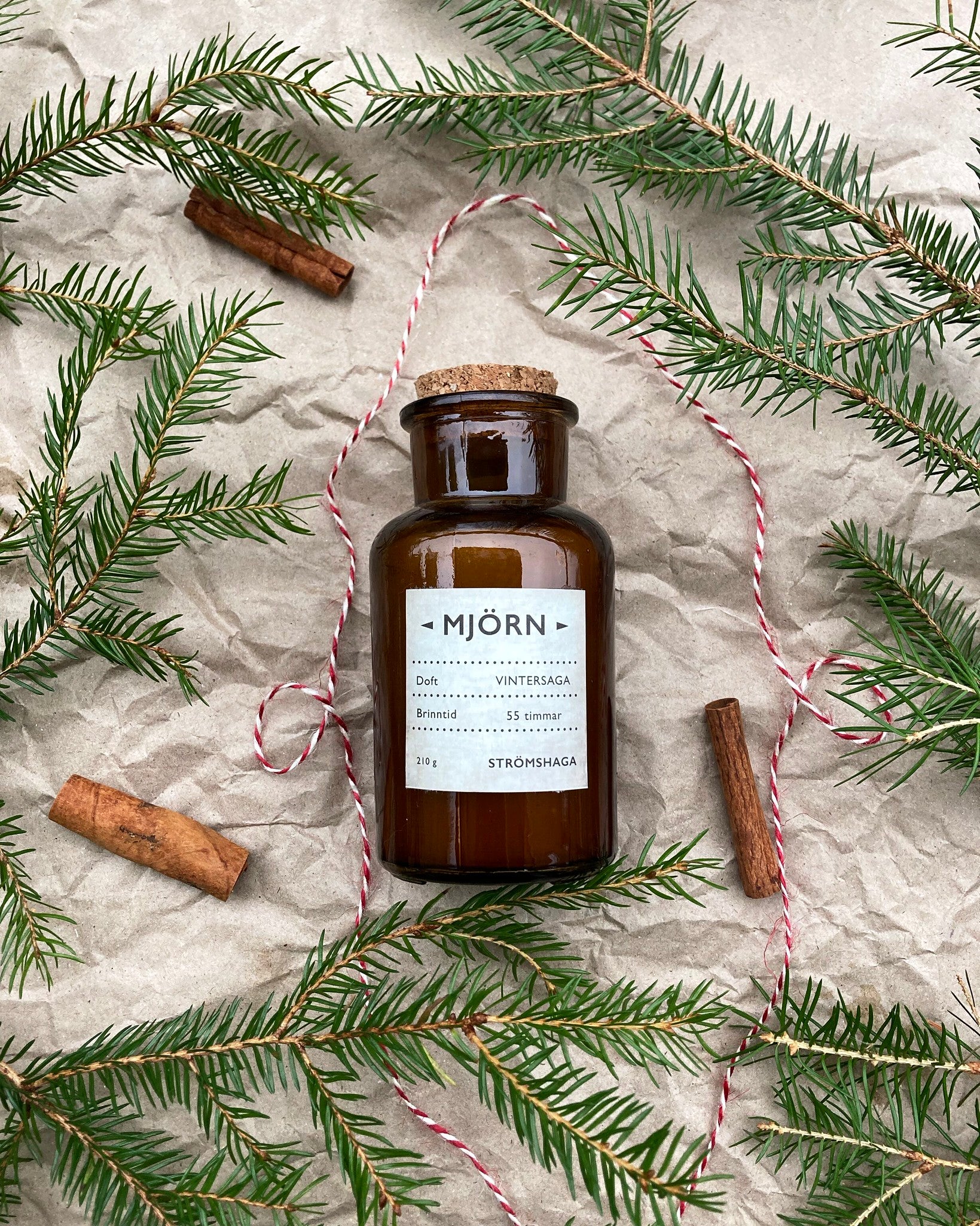 Illatgyertya barna üvegedényben, meleg, mély illattal, vanília, borostyán és friss levegő árnyalataival.
